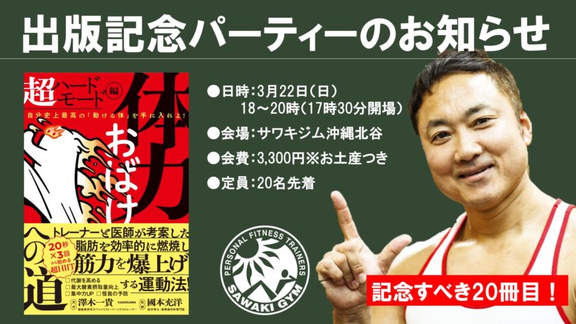 サワキジム代表・澤木一貴の新刊・体力おばけへの道 超ハードモード編の出版を記念して、サワキジム沖縄北谷内でパーティーを開催します。 「体力」「運動」「健康」をテーマに、ゆったり語り合う時間を大切にした会にします。 &#x […]