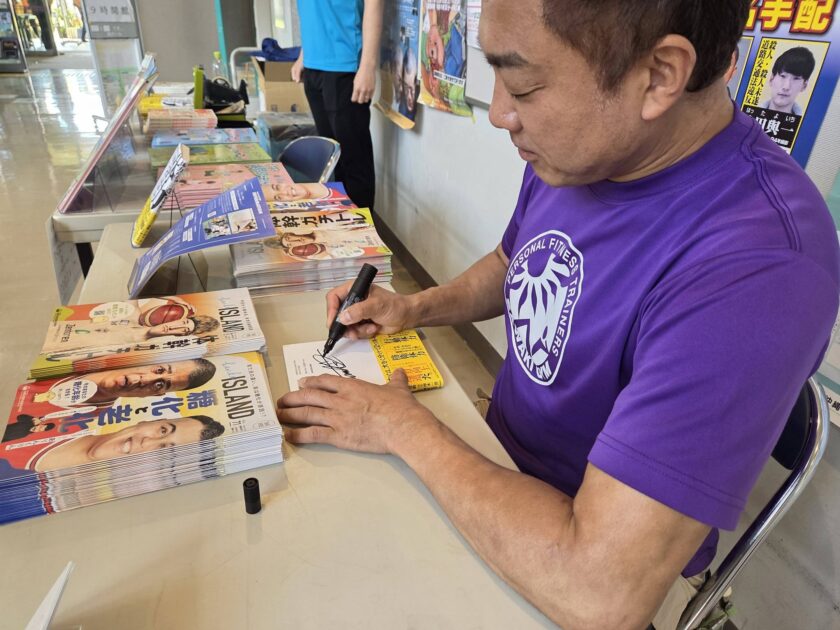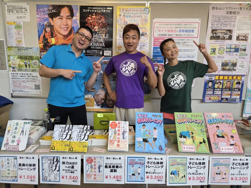 講演イベントの前後には、大城書店様が、澤木一貴の本の販売ブースを設置してくださり、『体力おばけへの道』をはじめ、6種類の本を販売してくださいました。購入された方にはもちろん澤木のサイン入りで。