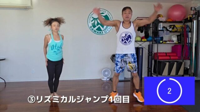 ジャンプ系の動きと体幹を使う動きを組み合わせ、強度の高い動きと、呼吸を整える動きを交互に配置しています。