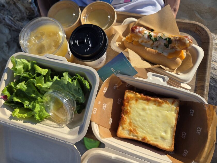 モーニングセットを購入し、波打ち際でいただきました(写真は、ホットドッグのセット、クロックムッシュのセット)。