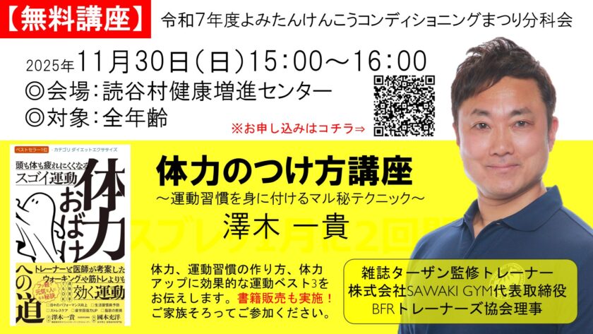 読谷から全国へ発信! 11月30日開催の『よみたんけんこうコンディショニングまつり』にて、サワキジム沖縄北谷・澤木一貴の無料講座が開催されます。 体力のつけ方講座 〜運動習慣を身に付けるマル秘テクニック〜 家族みんなで楽 […]